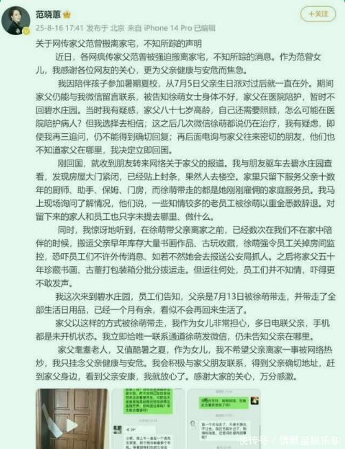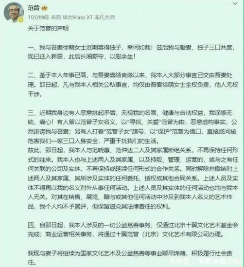 02这次没有含糊。声明里先报喜,87岁喜得独子,一家三口已搬入新居,生活稳定。紧接着一句话,把所有人砸懵。即日起,与长女范晓蕙、继子范仲达断绝关系。理由写得很重。恶意挑拨,造谣中伤,已经威胁到一家三口的人身安全。更关键的还在后面。老人把名下事务、生前身后事的处理权,全部交给妻子徐萌。一句话,范家的钥匙,正式换人。这时再回看8月的“失联”,很多人突然明白,那并非意外。搬家,清人,断亲,每一步都在为新家庭让路。可外界难以接受的,是这一步走得太狠。范曾早年的婚姻并不顺。第一任妻子边宝华陪他走过低谷,女儿范晓蕙正是那段婚姻的孩子。后来感情生变,分开收场。再婚后,张桂云带来的两个孩子改姓范,在这个家生活了三十多年。范仲达这些年鞍前马后,几乎被默认是“自己人”。几十年的相处,被一张纸全部抹掉。