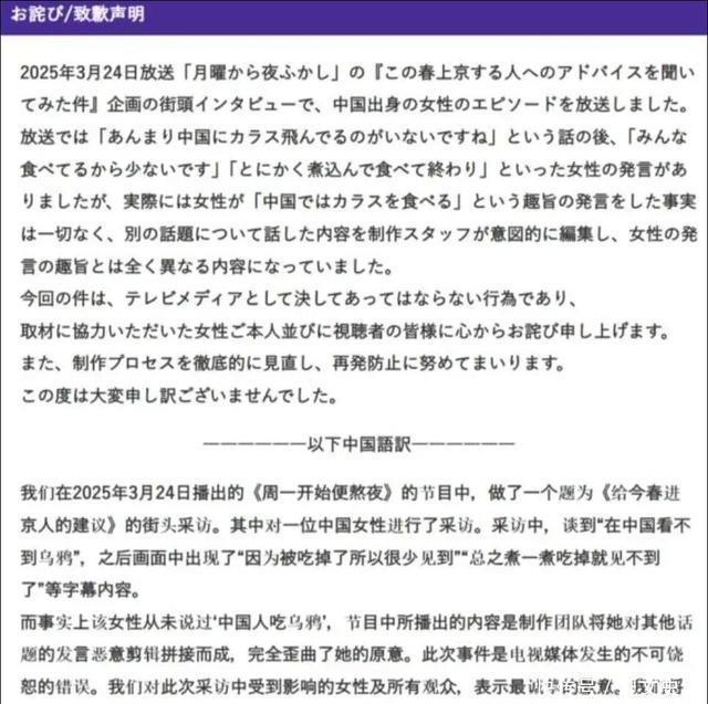 至于再后面女子说的话,就是日本媒体恶意剪辑后大家看到的内容了,前面“乌鸦”被留下了,“中国吃鸽子”被剪辑掉了,后面“吃太多”也被留下了,所以就剩下了“中国人吃乌鸦”。 直到该女子的言论被日本网民网暴,她才意识到自己随意接受的街头采访被掐头去尾恶意剪辑了,所以她向节目组进行了抗议,节目组也认识到了自己的错误并公开用中文和日文进行了道歉。